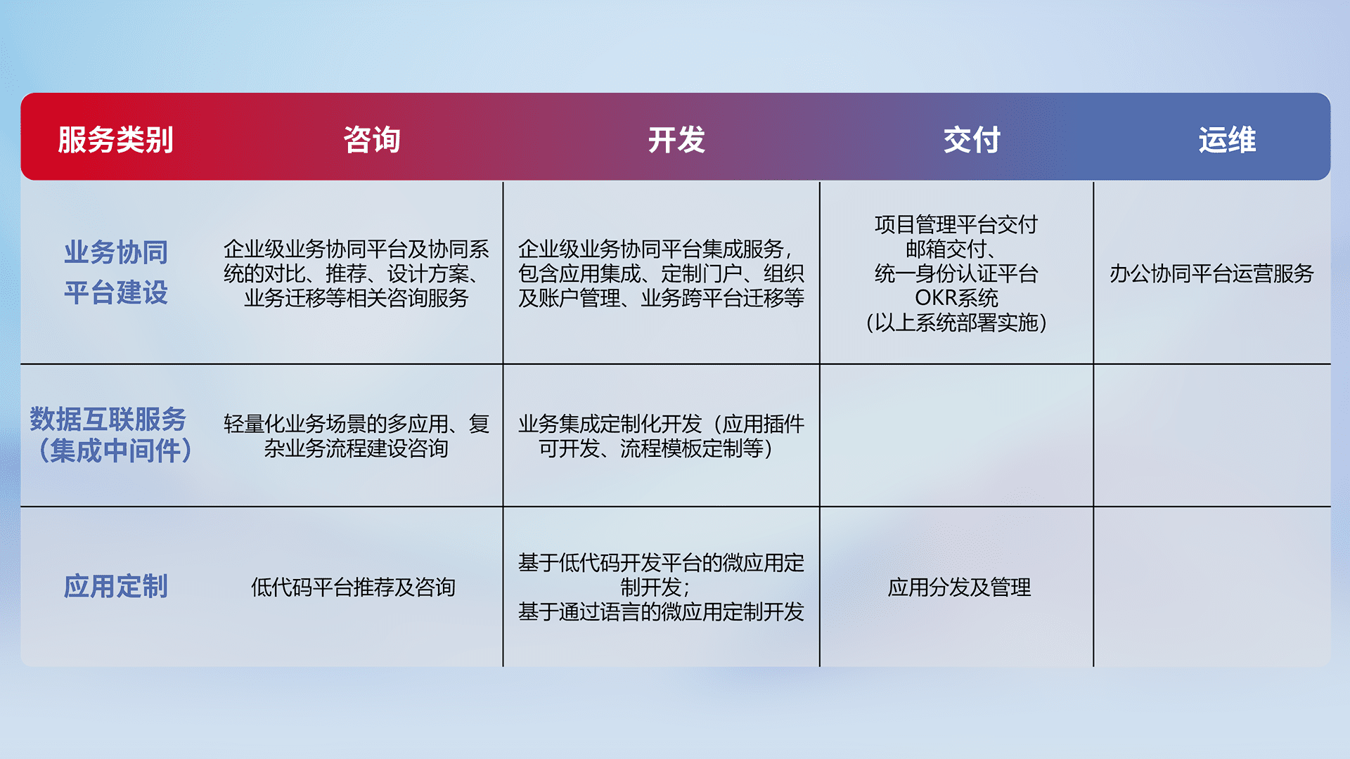 针对钉钉、、、企微、、、、IDaas等平台级产品提供产品的规划、、、方案、、、、交付、、、定制化开发等服务,,,,实现如统一协同办公、、、智能客户服务、、混合会议管理、、、、智能数据查询、、、、等业务场景,,,实现数字化转型。。。