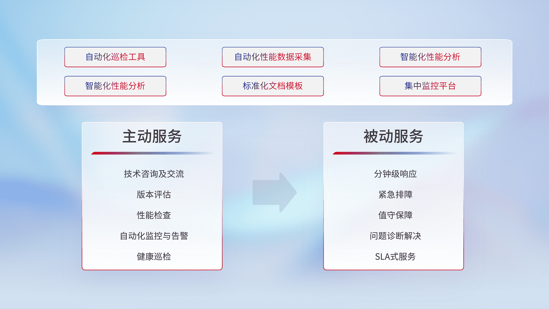 智能化工具和标准化文档,,保障服务质量,,,,提供主动服务(包含技术咨询、、、、版本评估、、、性能检查、、、、自动化监控与告警、、、、健康巡检)和被动服务包含(分钟级响应、、、、紧急排障、、、、值守保障、、问题诊断解决、、SLA服务)。。。。